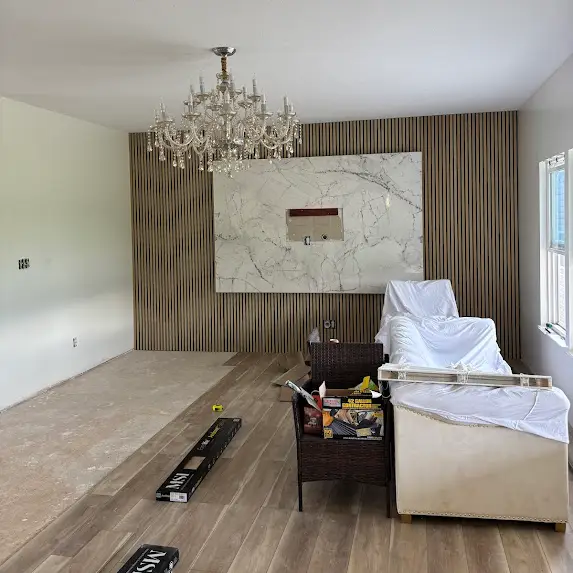 The other day at Craft&Repair LLC, we took on a task a client in Englewood described as “simple, nothing fancy” for his media wall design. We agreed clarity is best sometimes, but spotted how we could present simplicity without it being bland. The design we proposed was neat and contemporary, introducing a large 8×6 marble slab to subtly draw attention, while harmonizing it with custom-made wooden panels matching the tone and layout of the floor for a consistent look.
