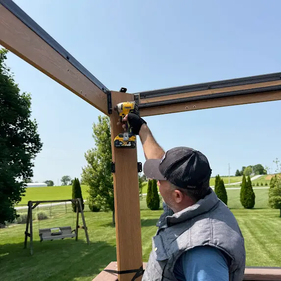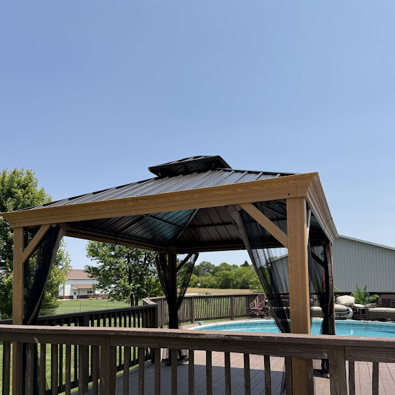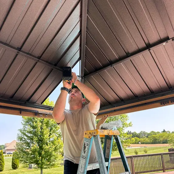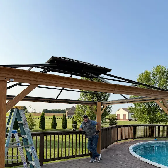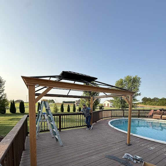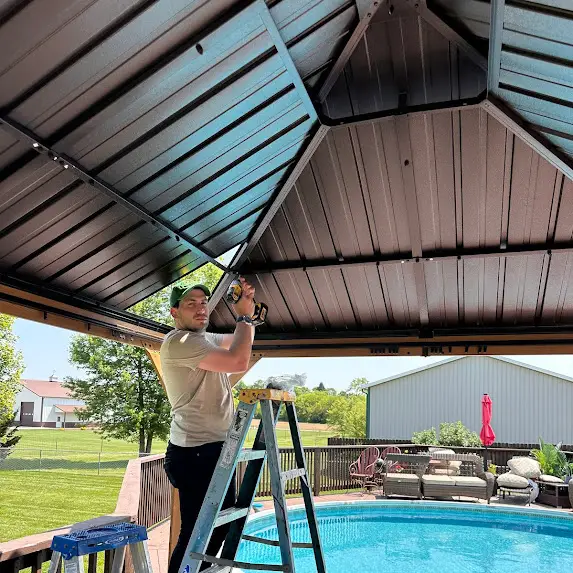Today, the team at Craft&Repair LLC successfully installed a gorgeous Kozyard 10×12 Aluminum Pergola on a client’s backyard deck. This customer sought to create a shaded retreat by his pool for the upcoming summer. He was facing ridiculously high quotes from other service providers, but we were able to offer him a significantly lower price, without compromising on quality or professionalism. Our experts precisely and securely anchored the pergola to the deck.